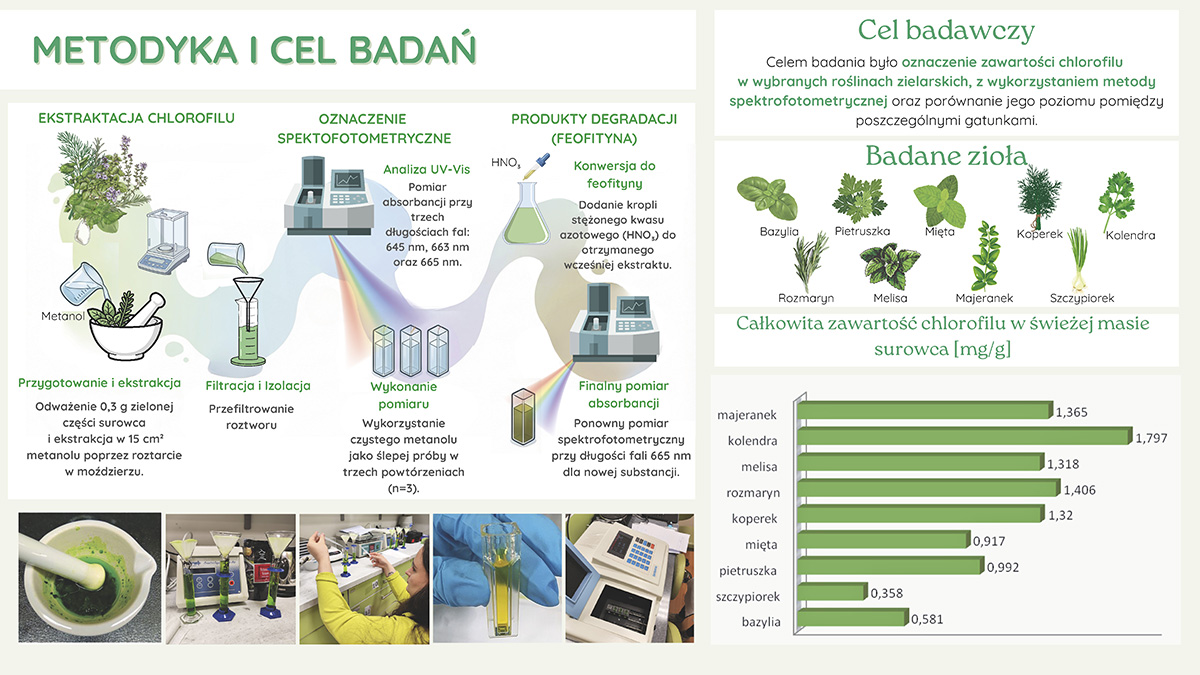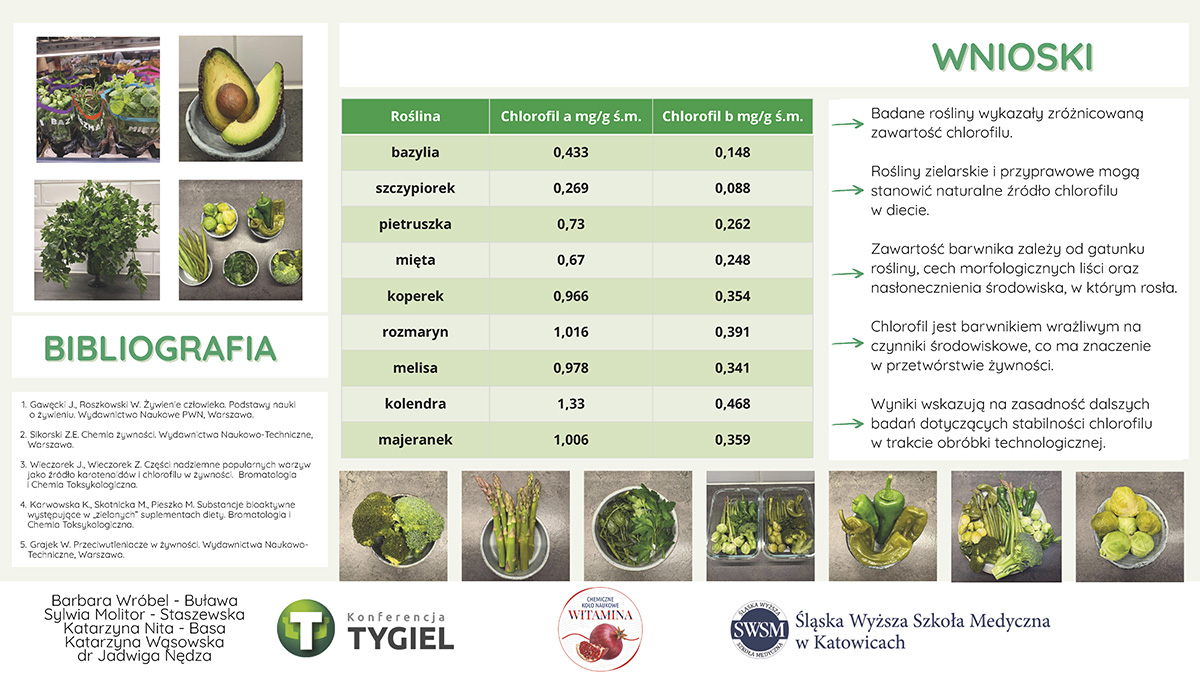 Panią Sylwię Molitor-Staszewską, panią Katarzynę Nitę-Basa i panią Barbarę Wróbel-Buławę, które zaprezentowały pracę w formie posteru naukowego pt. „Zielono mi – chlorofil w wybranych roślinach zielarskich”.