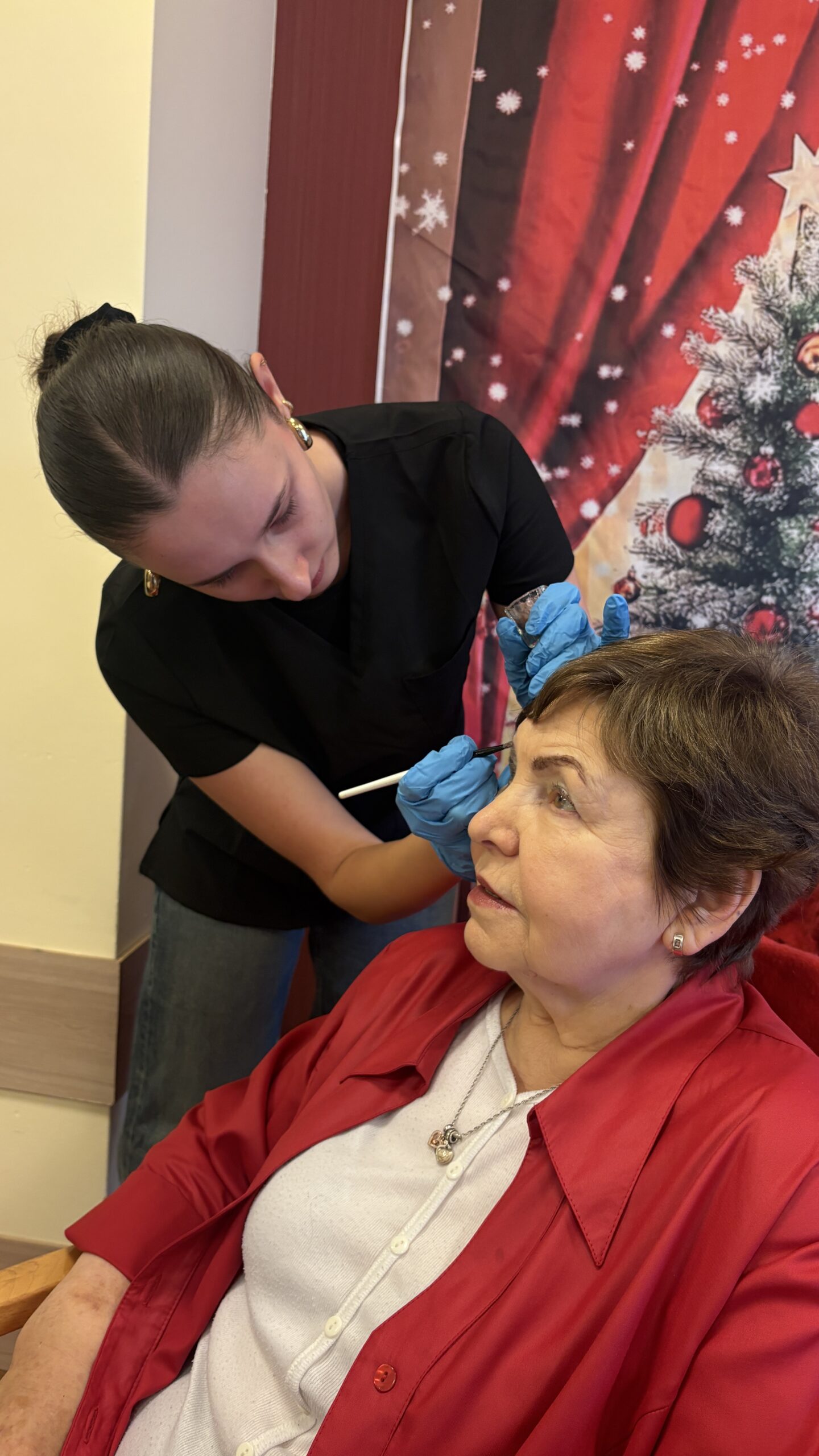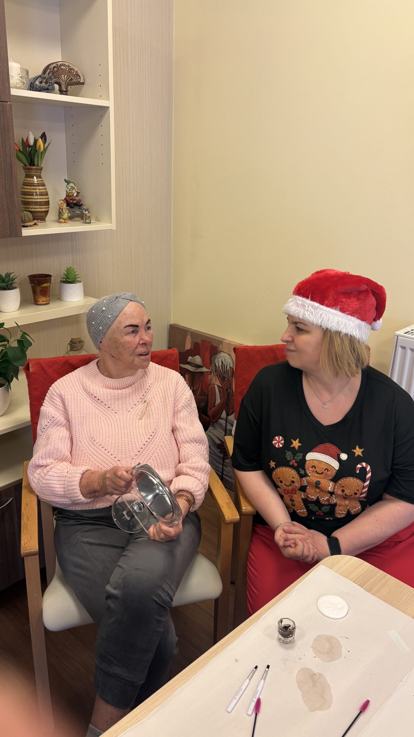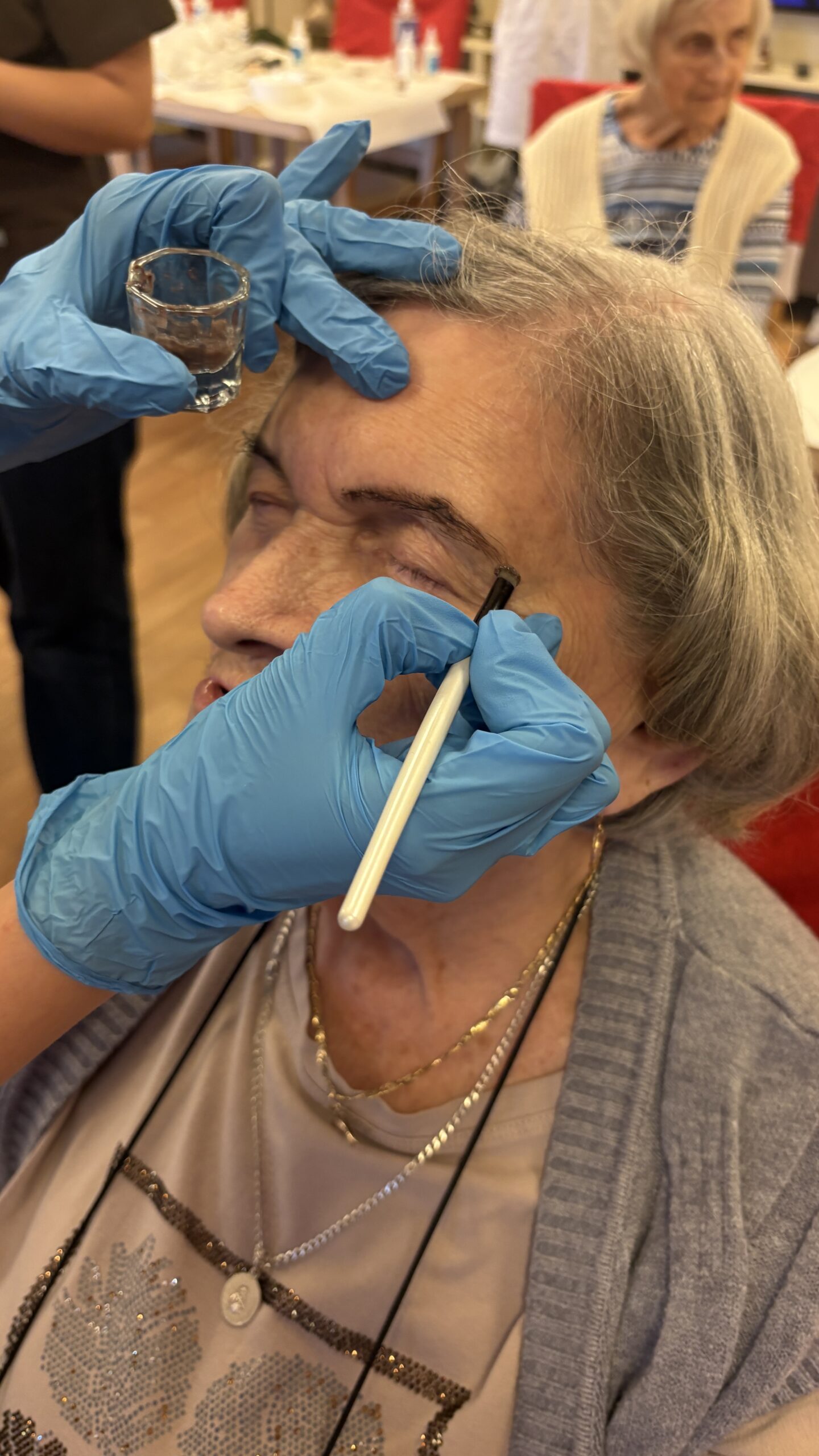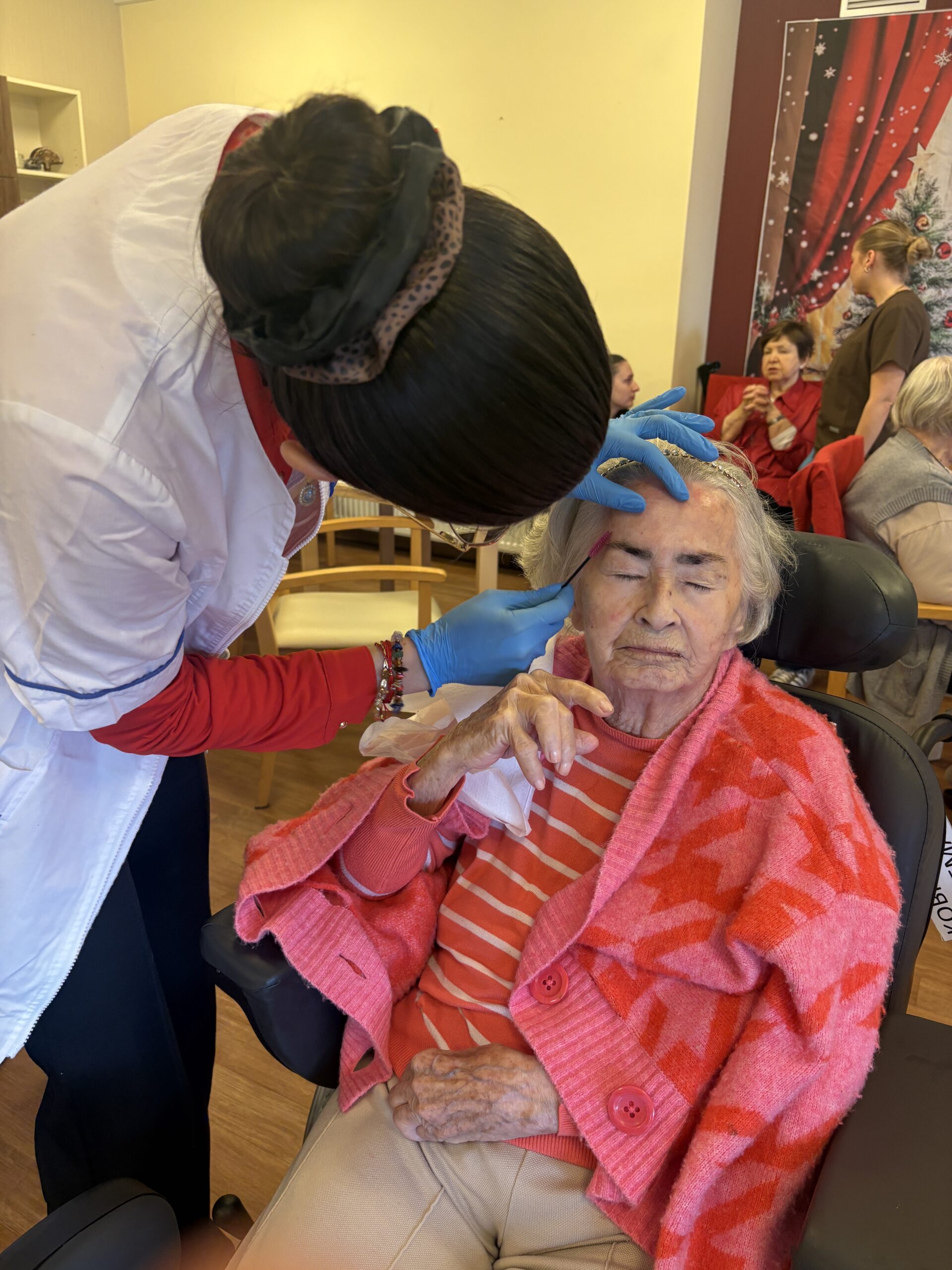 Podczas wizyty studentki wykonywały henne pudrową brwi oraz relaksujący masaż dłoni, dostosowany do potrzeb i komfortu mieszkańców.